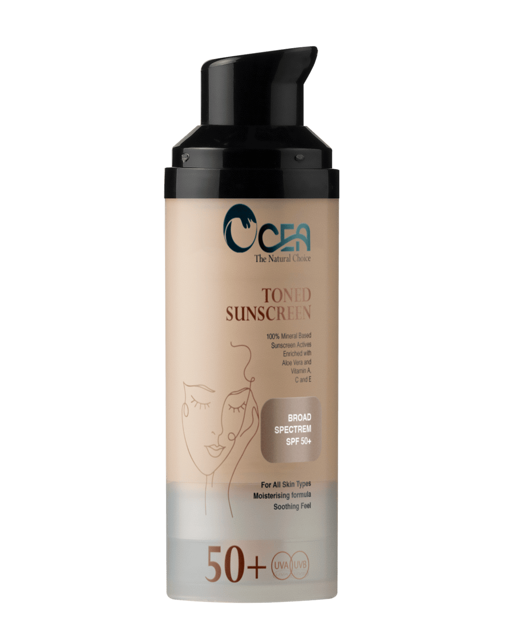 Ocea Toned Sunscreen SPF 50+ with 100% mineral based sunscreen actives. Enriched with Aloe Vera and Vitamin A, C and E. Broad spectrum protection. For all skin types. Moisturising formula with soothing feel. Shade 5.