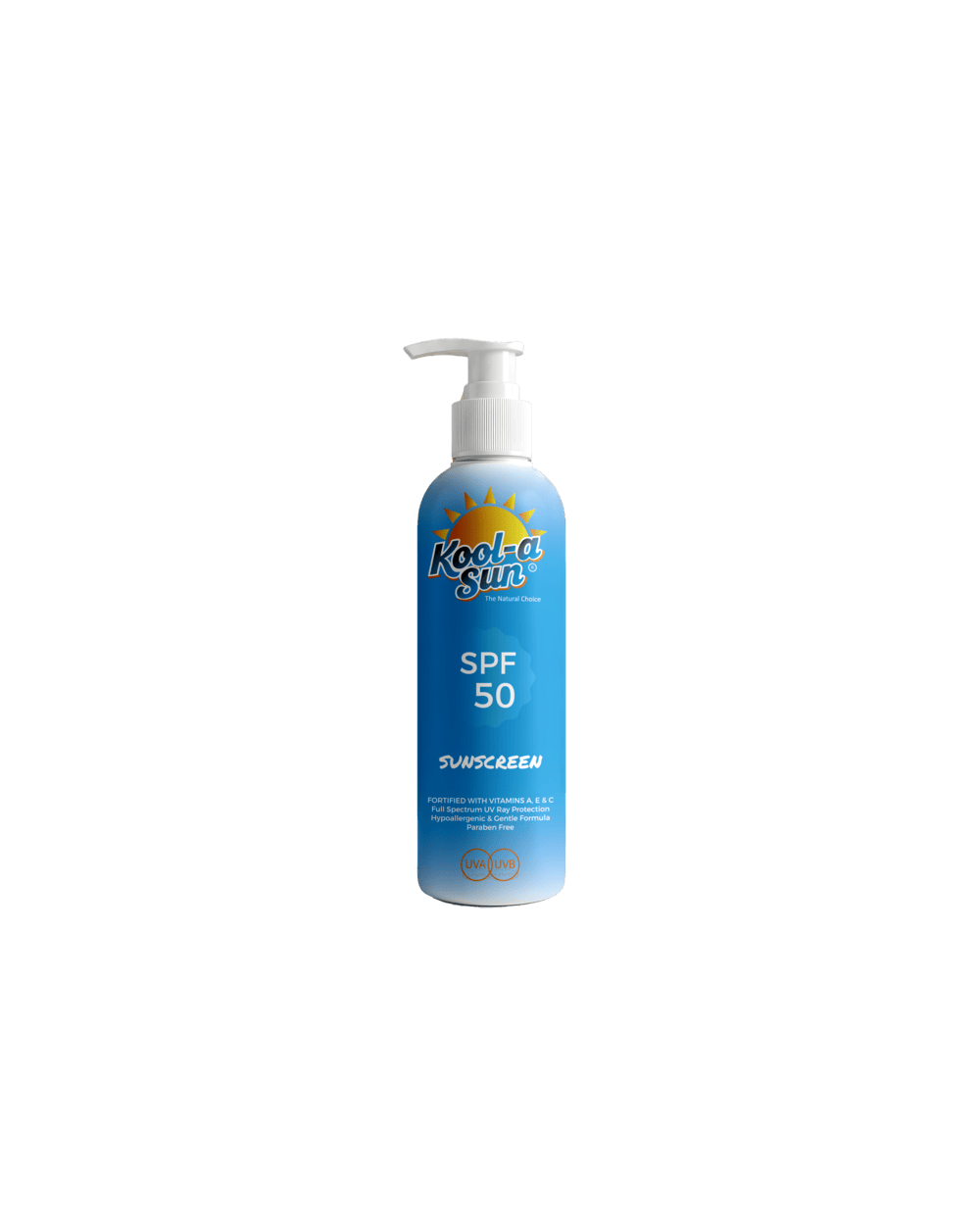 200ml pump bottle of SPF 50 sunscreen for maximum protection. Enriched with Vitamins A, C, and E. Water resistant for up to 80 minutes.